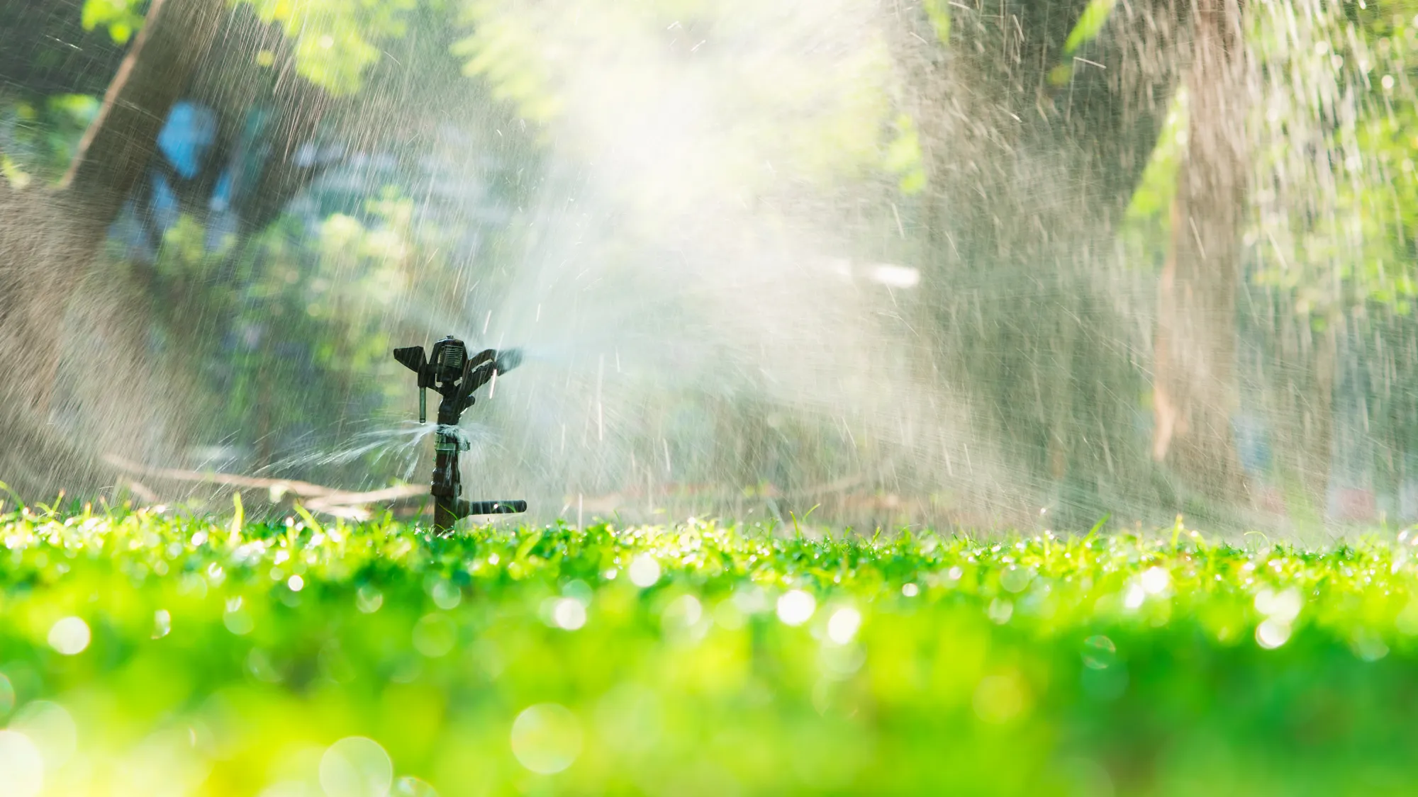 Closeup low angle view of automatic lawn sprinkler watering in the garden using as agricultural and fresh cover page concept
