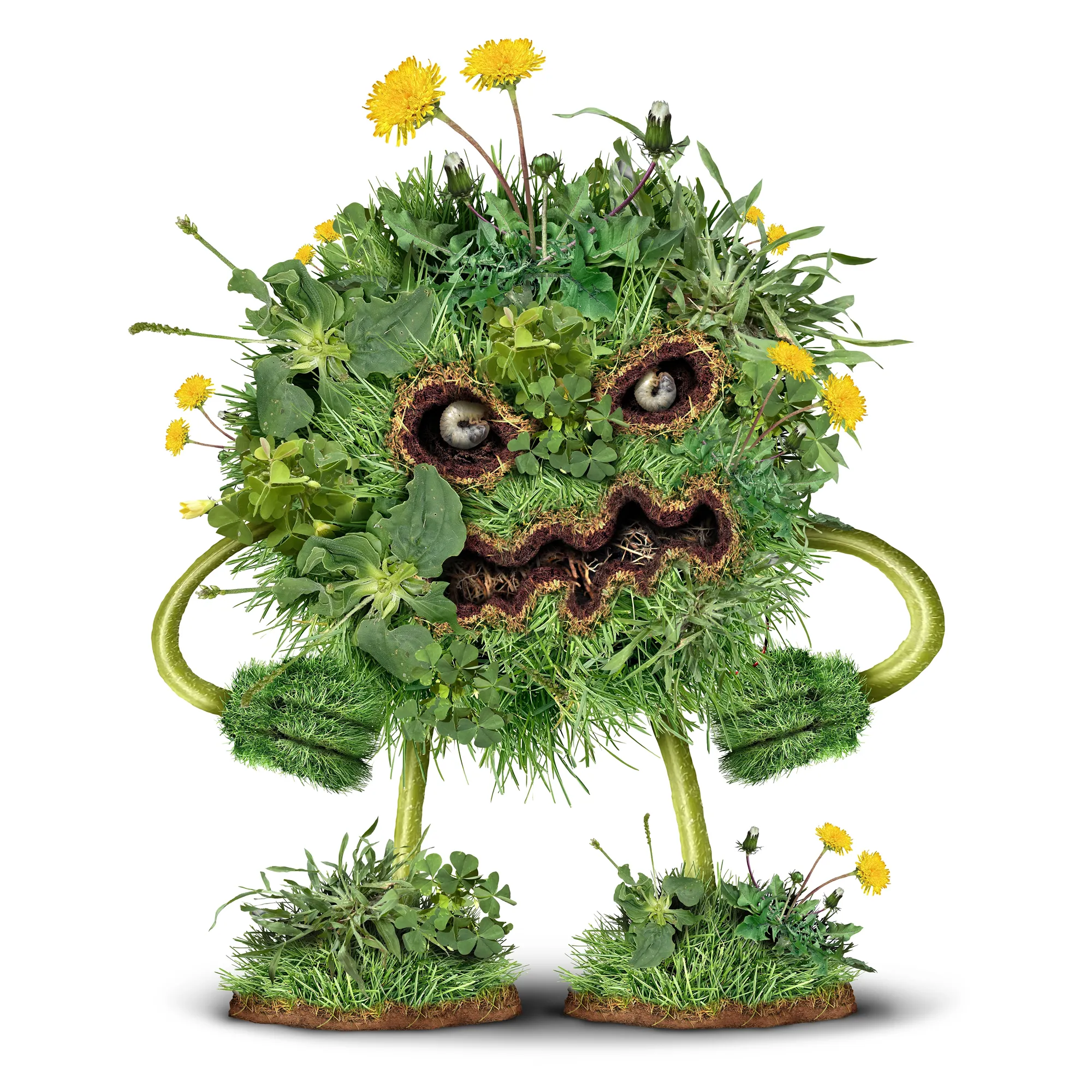 Lawn Weeds character and weed monster as dandelion with clover crab grass pest weeds problem as a symbol for herbicide use in the garden or gardening for lawn care and grubs destroying roots.