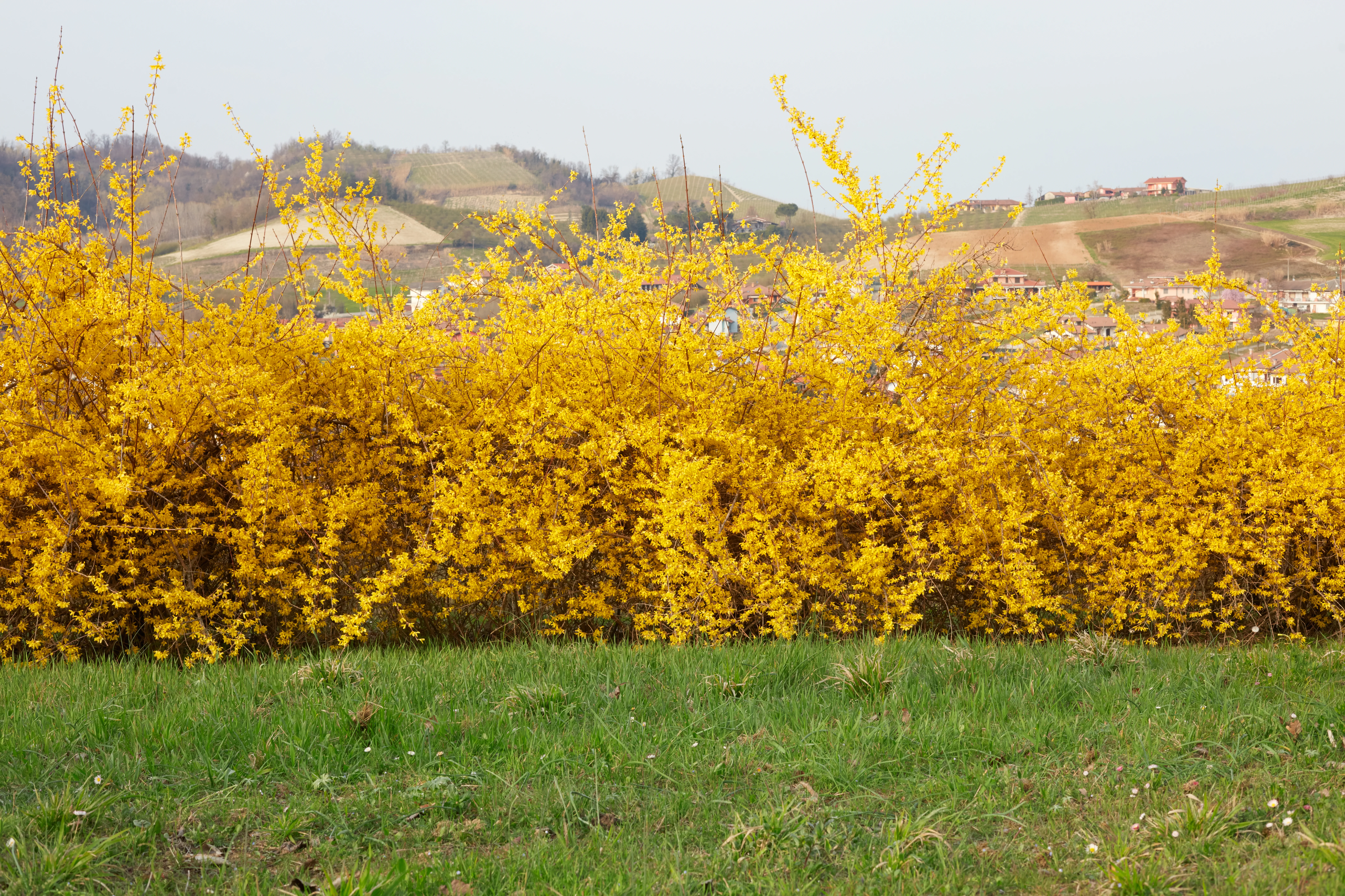 - In spring, Forsythias produce stunning yellow flowers, making them a popular choice for hedges. Prune your Forsythia hedge after flowering to maintain its shape and promote denser growth next year.