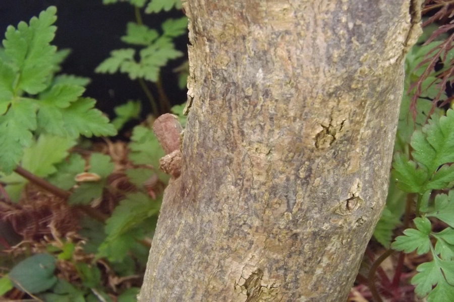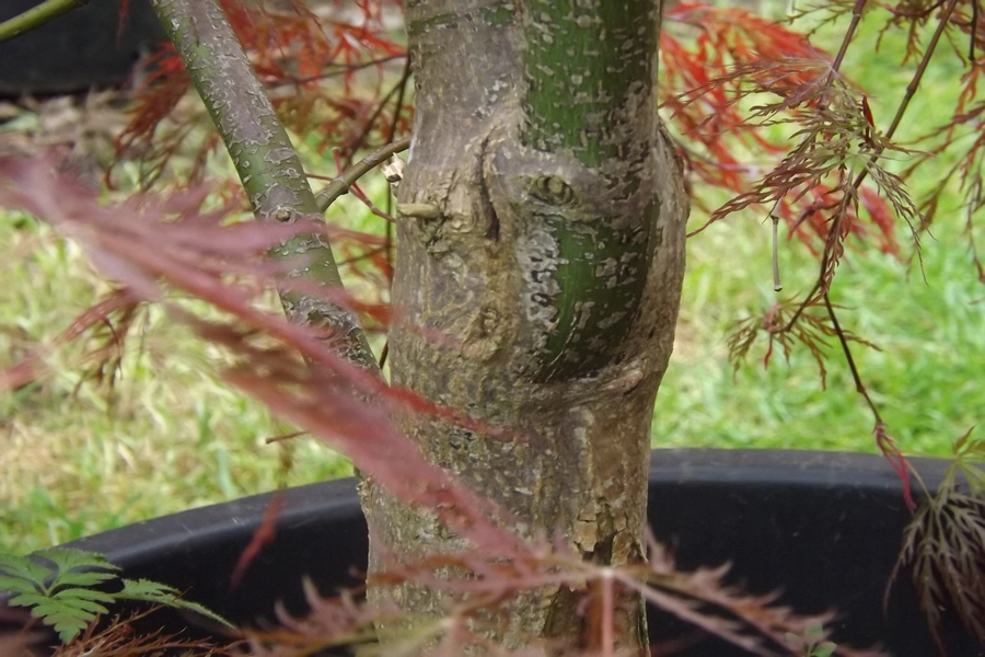 If planted out it can reach a height of a meter and a half with a two meter spread, our Inaba Shidare pictured and featured in the video is still potted and after 30 years it is close to a meter high. The trunk is thick and the main branches go up and then droop horizontally, you can see in the image "Crown Branch" how strong it is. It has to hold all the smaller branches which cascade down. The smaller branches are thin and twiggy and hold a large network of leaves, the leaves are delicate and seem to weigh nothing, but just by the amount of number of leaves they pull the branches down, giving the cascading effect.
