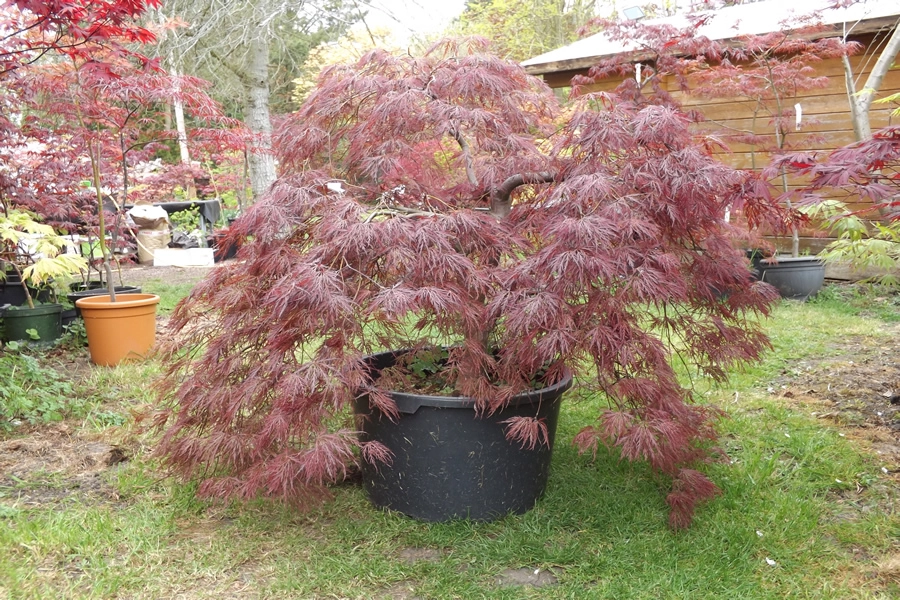 Acer Palmatum Dissectum Inaba Shidare is a dwarf Japanese Maple, and the name Shidare means cascading, if placed above a pond the leaves will cascade into the water, giving a weeping willow effect. An excellent complement to any Koi Carp Pond or Japanese Garden. If you keep it in a pot it can be made into a patio feature or a courtyard feature, think about its characteristics and build it in. Unfortunately it does not enjoy full sun, infact it prefers shaded areas. With that in mind, it is ideal in the corner with its back to a wall, in this case baby wants to be in the corner.